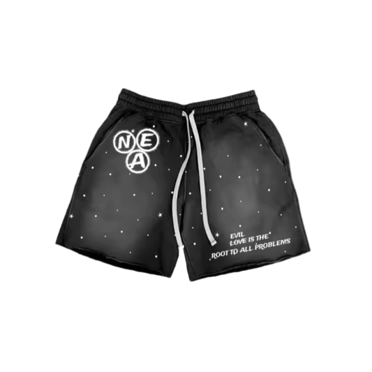 “Evil Is The Root To All Problems” acid wash shorts