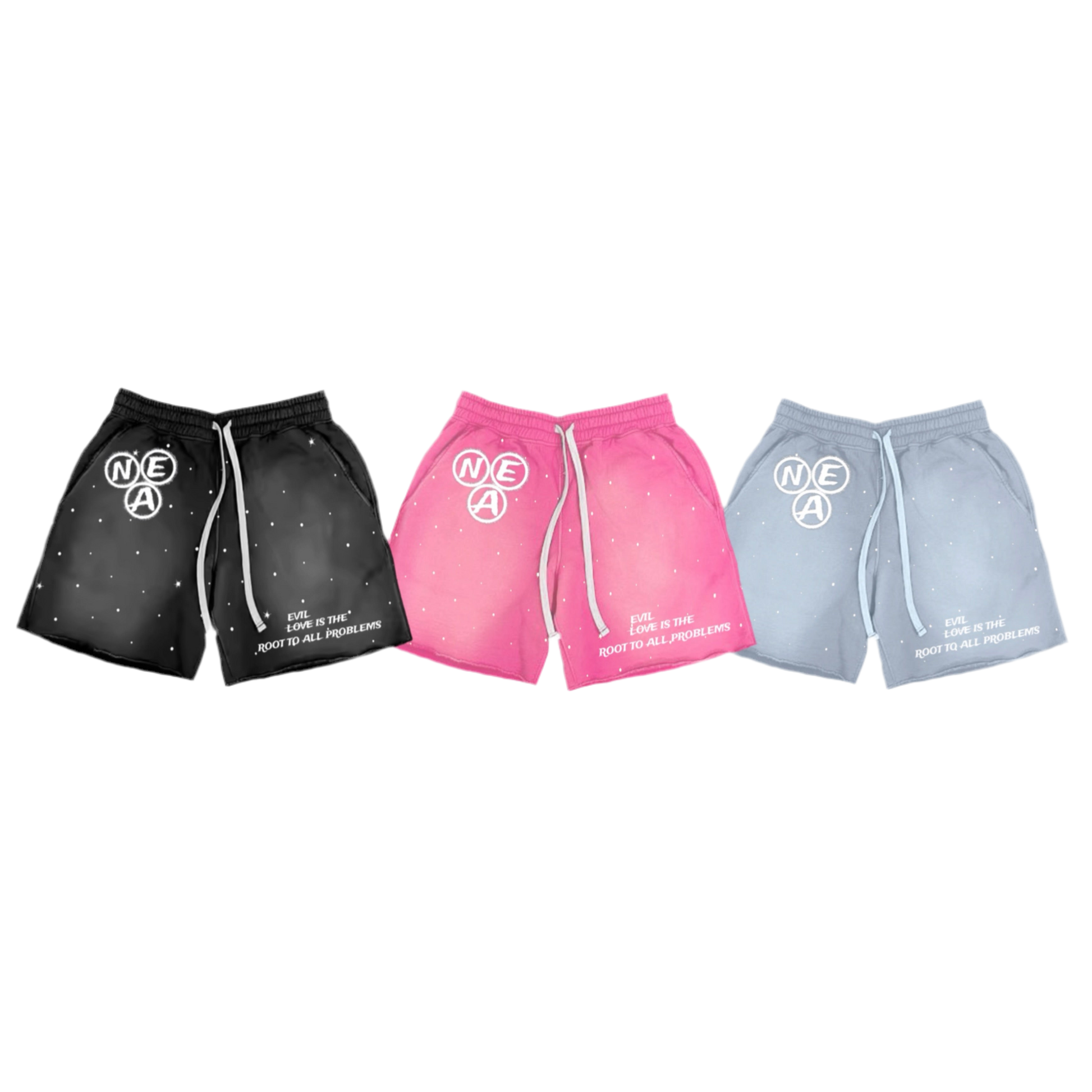 These stylish shorts feature an eye-catching acid wash effect with distressed embroidered "N E A" on the right leg and embroidered words on the left leg. It also includes rope drawstrings. It also showcases rhinestones scattered throughout, while the pockets and bottom have small distressed rips.